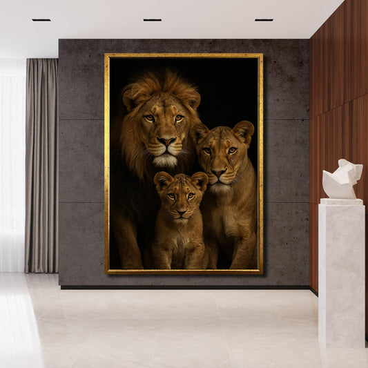 Majestic Black Lion Gaze in Golden Floral Frame Canvas Art