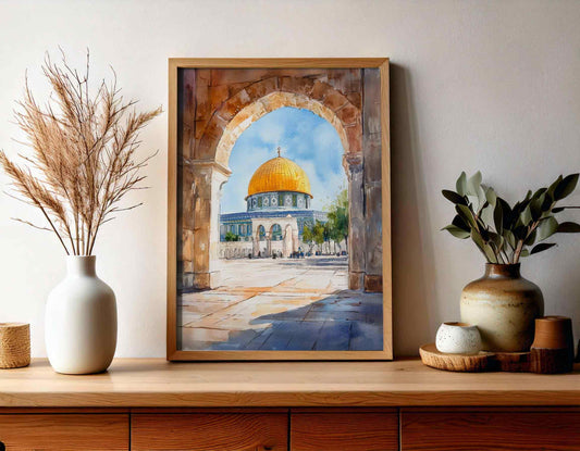 Watercolor Dome of the Rock Poster - Islamic Archway Wall Art Decor
