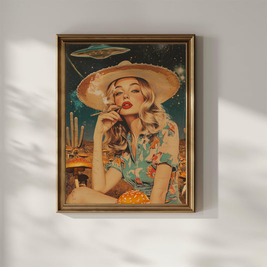 Psychedelic Vintage Collage Wall Art - Cowgirl, Mushrooms & UFO Decor