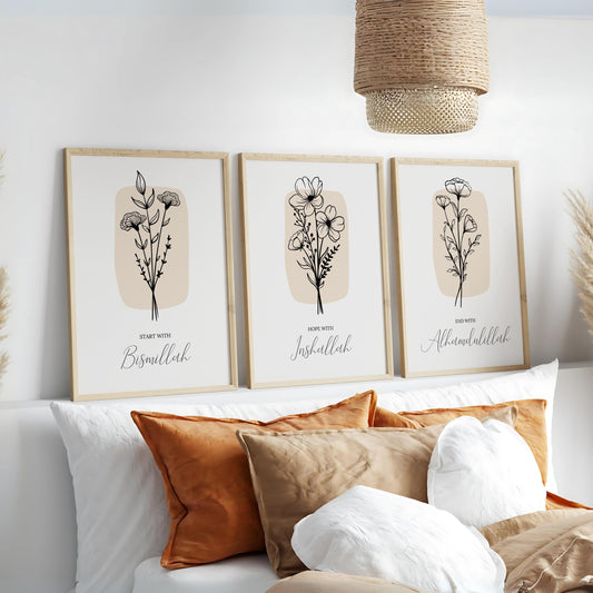 Bismillah Inshallah Alhamdulillah Islamic Wall Art - Floral Triptych