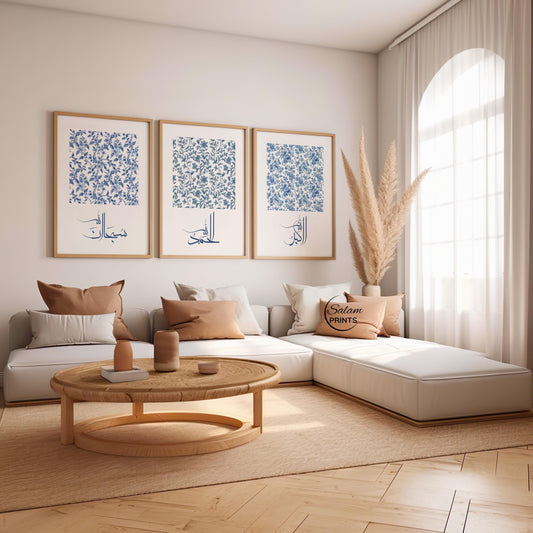 Islamic Calligraphy Wall Art Set of 3 – Blue White Dhikr Decor