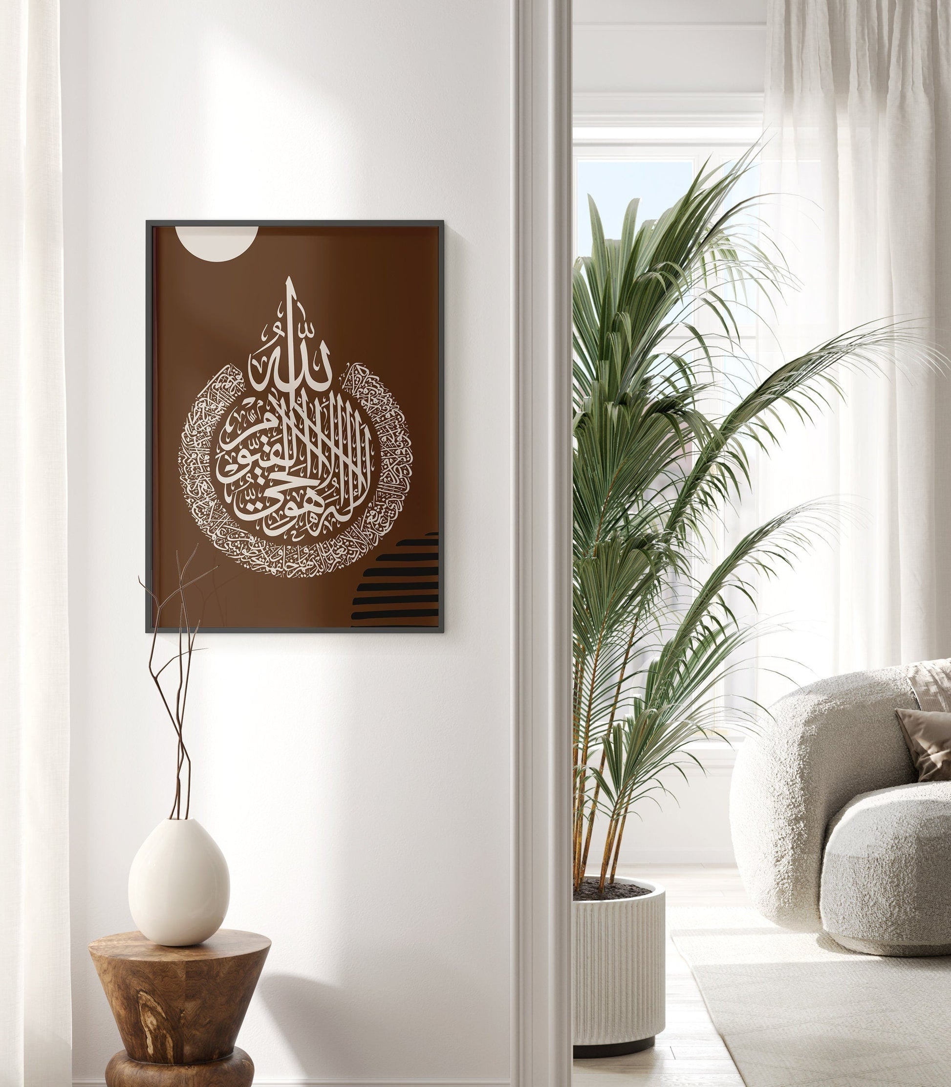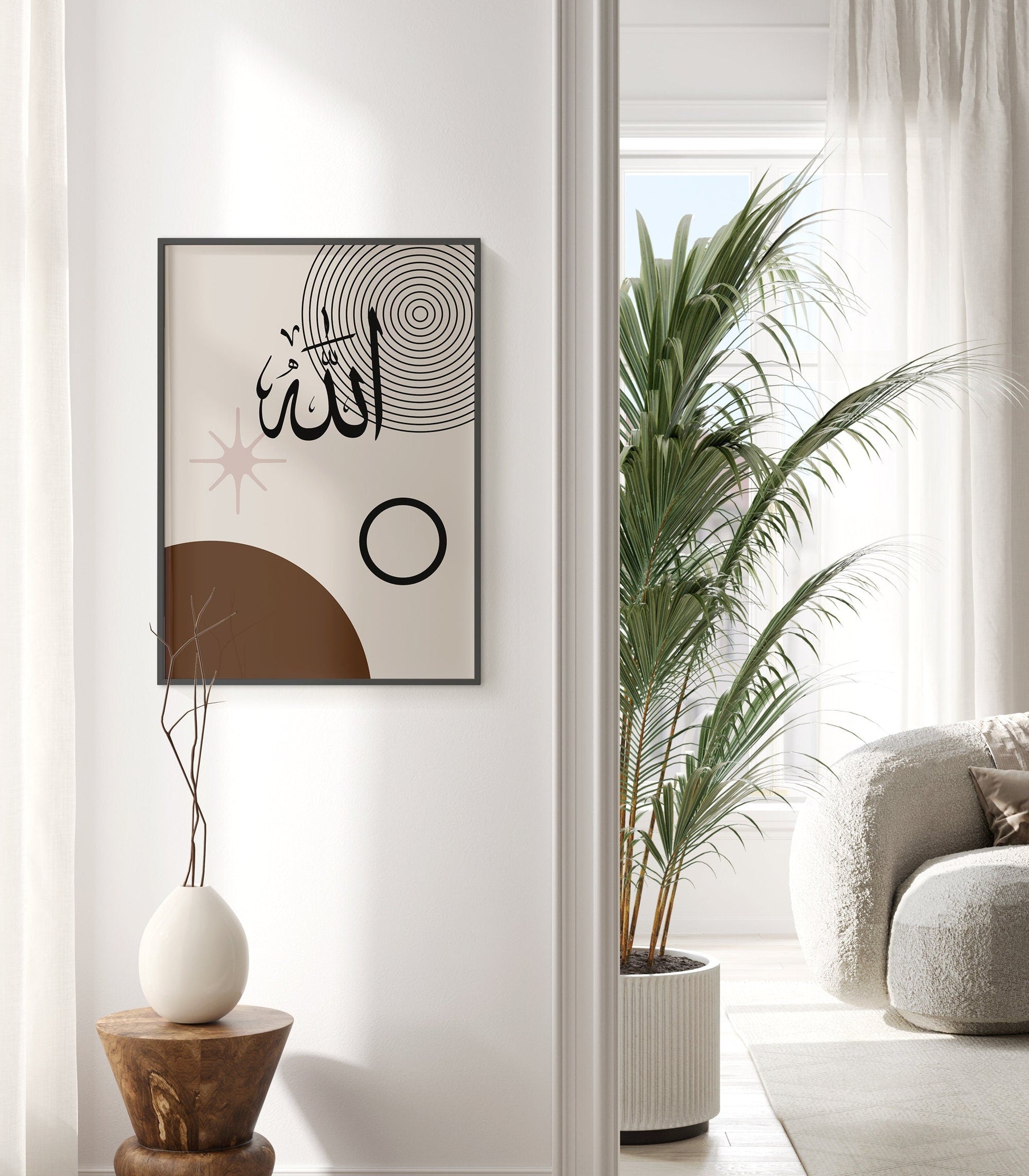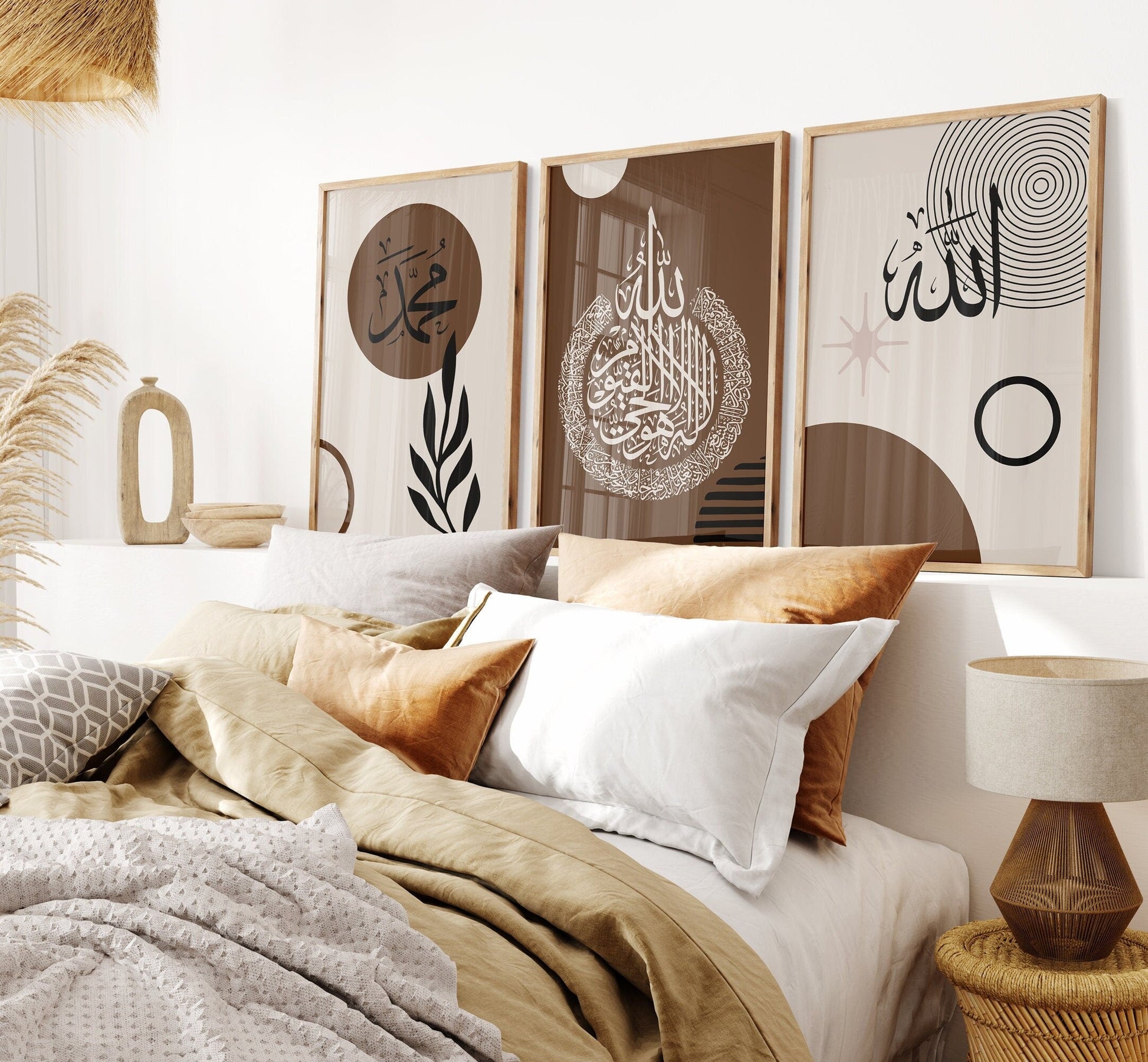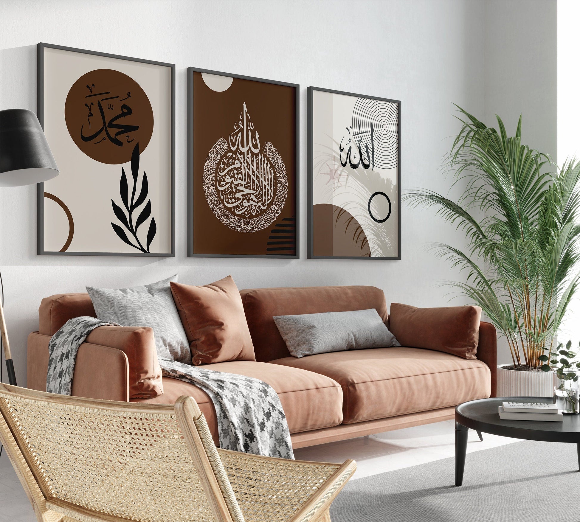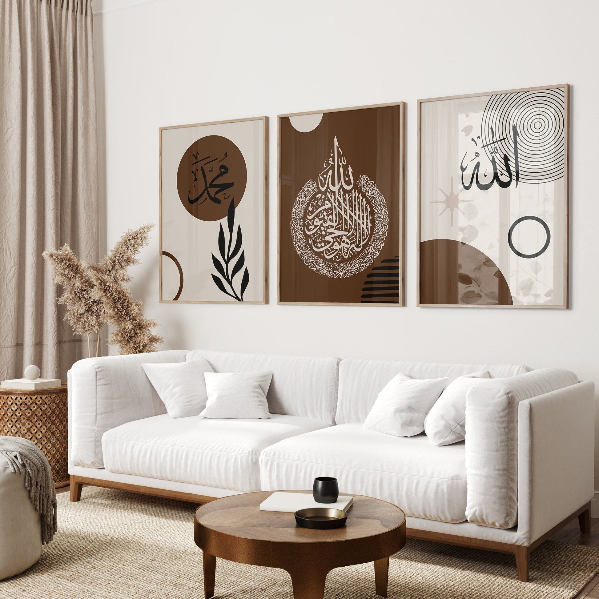 Elevate your home décor with our Islamic Wall Art Set of 3 featuring elegant Arabic calligraphy of Allah, Ayatul Kursi, and Muhammad. Designed in a soothing boho style with warm brown and beige tones, this set adds a modern yet spiritual touch to any space. Perfect for living rooms, bedrooms, or prayer areas, these high-quality prints make a thoughtful gift for loved ones or a serene addition to your own home. Bring faith and tranquility into your surroundings with this timeless Islamic art collection.