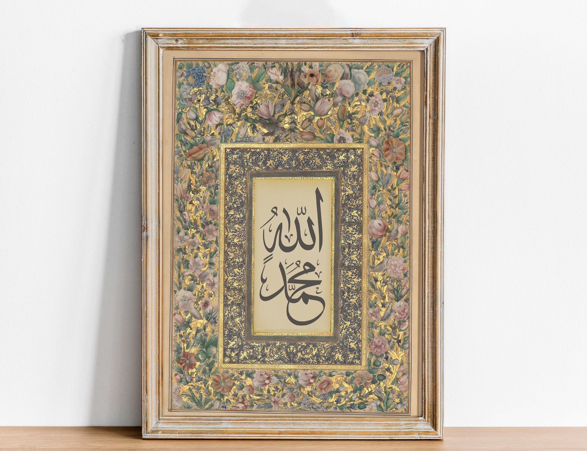 Elevate your space with our exquisite Allah & Muhammad (PBUH) calligraphy print. This modern Islamic wall art combines beautiful botanical elements with elegant Arabic calligraphy. Perfect for adding a touch of faith and sophistication to your home or as a meaningful wedding gift. Discover the beauty of Islam through this stunning piece.