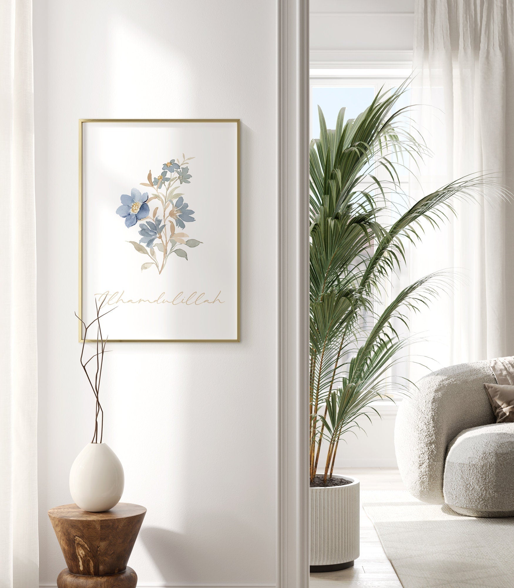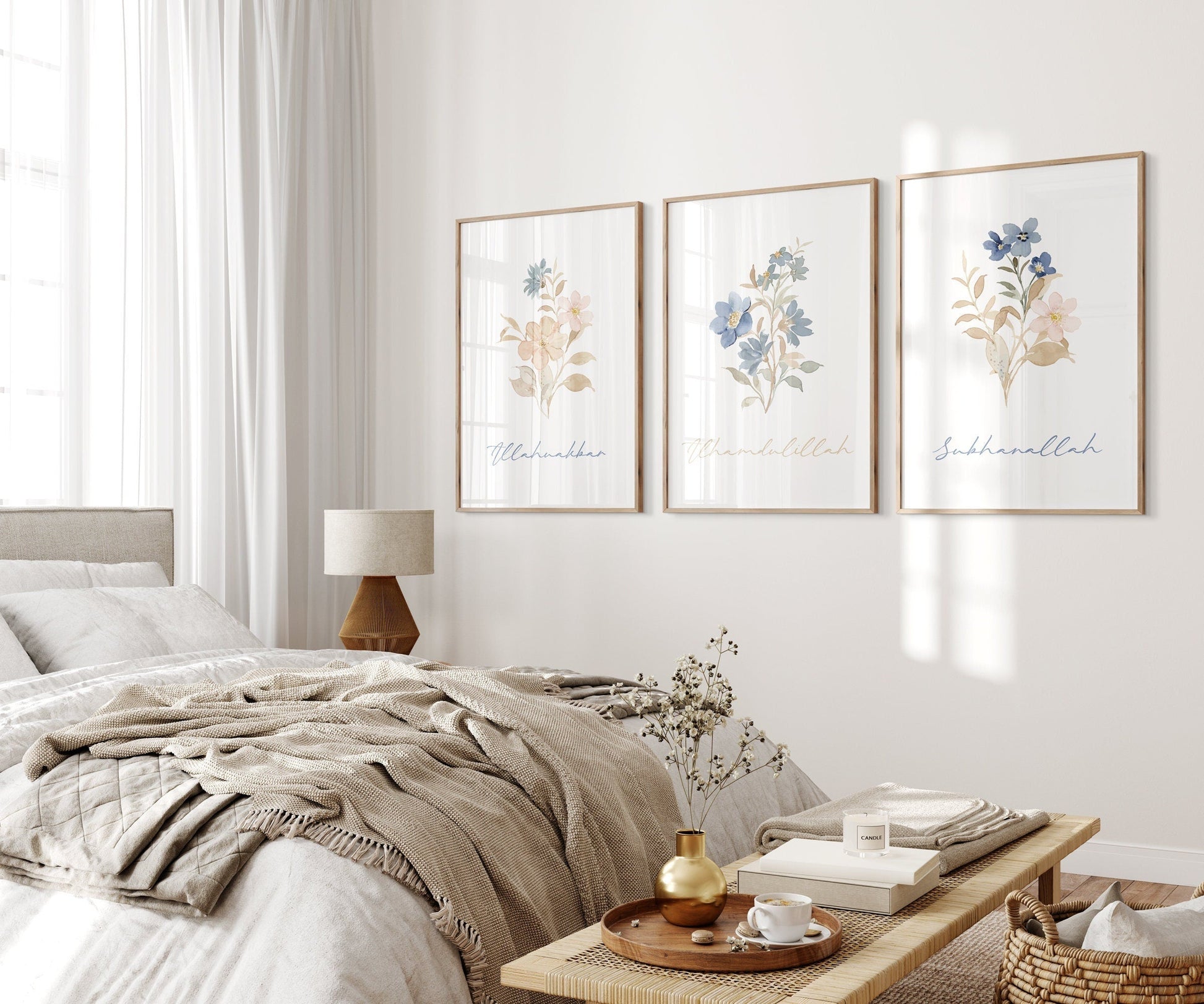 Elevate your space with this beautiful set of 3 Floral Islamic Wall Art Prints. Featuring the words "Subhanallah," "Alhamdulillah," and "Allahuakbar," each print combines minimalistic design with elegant floral patterns, creating a serene atmosphere in any room. Perfect for living rooms, prayer areas, or offices, this set brings peace and spirituality into your home decor. Crafted with care, these prints make a thoughtful gift for loved ones or a meaningful addition to your own space.