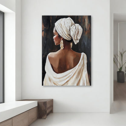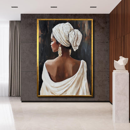 A refined canvas painting featuring a graceful woman, rendered in warm tones with a modern, timeless vibe. This framed wall art arrives ready to hang and suits living rooms, bedrooms, or office spaces. Celebrating African beauty and elegance, it makes a sophisticated gift for contemporary homes.
