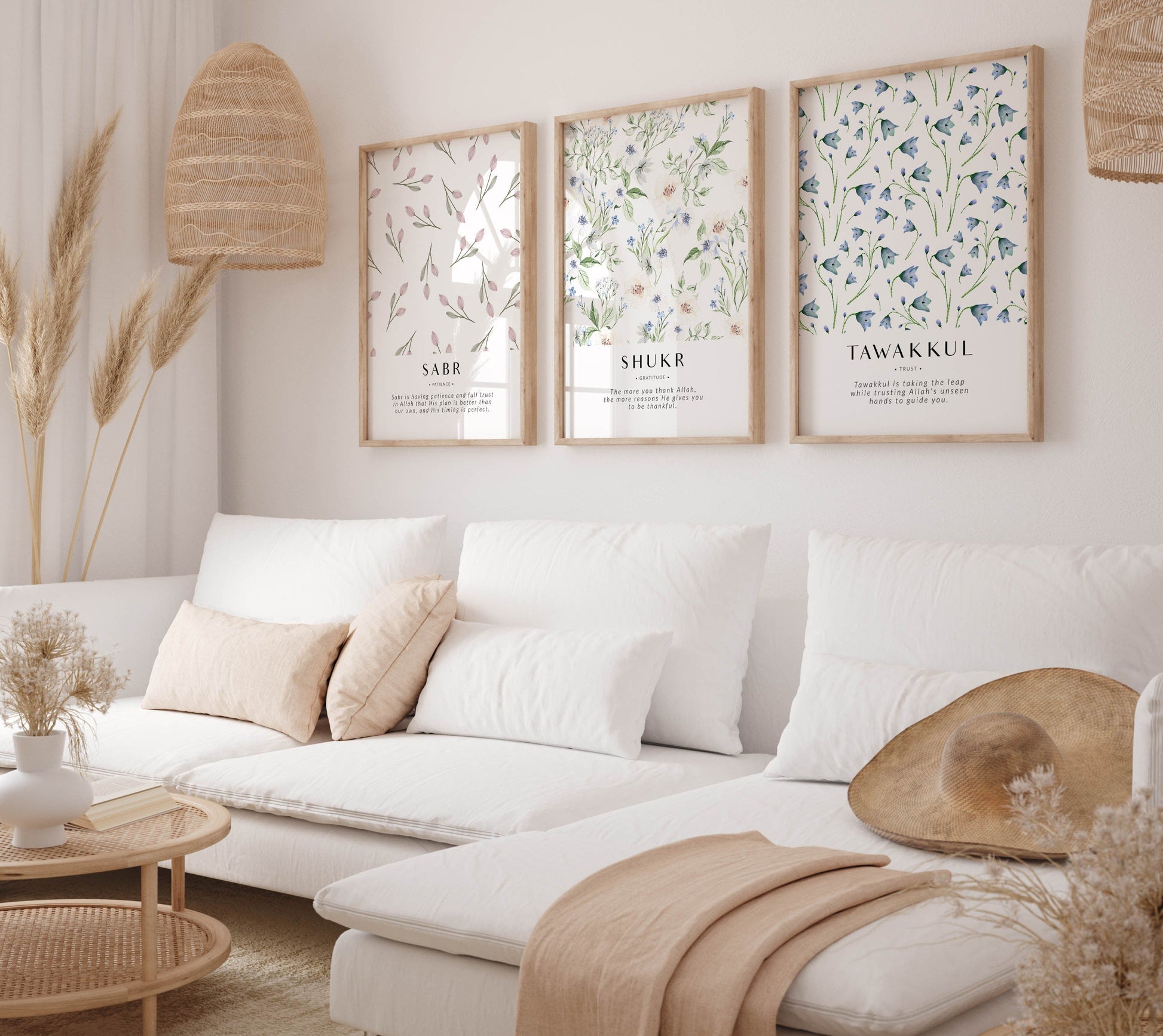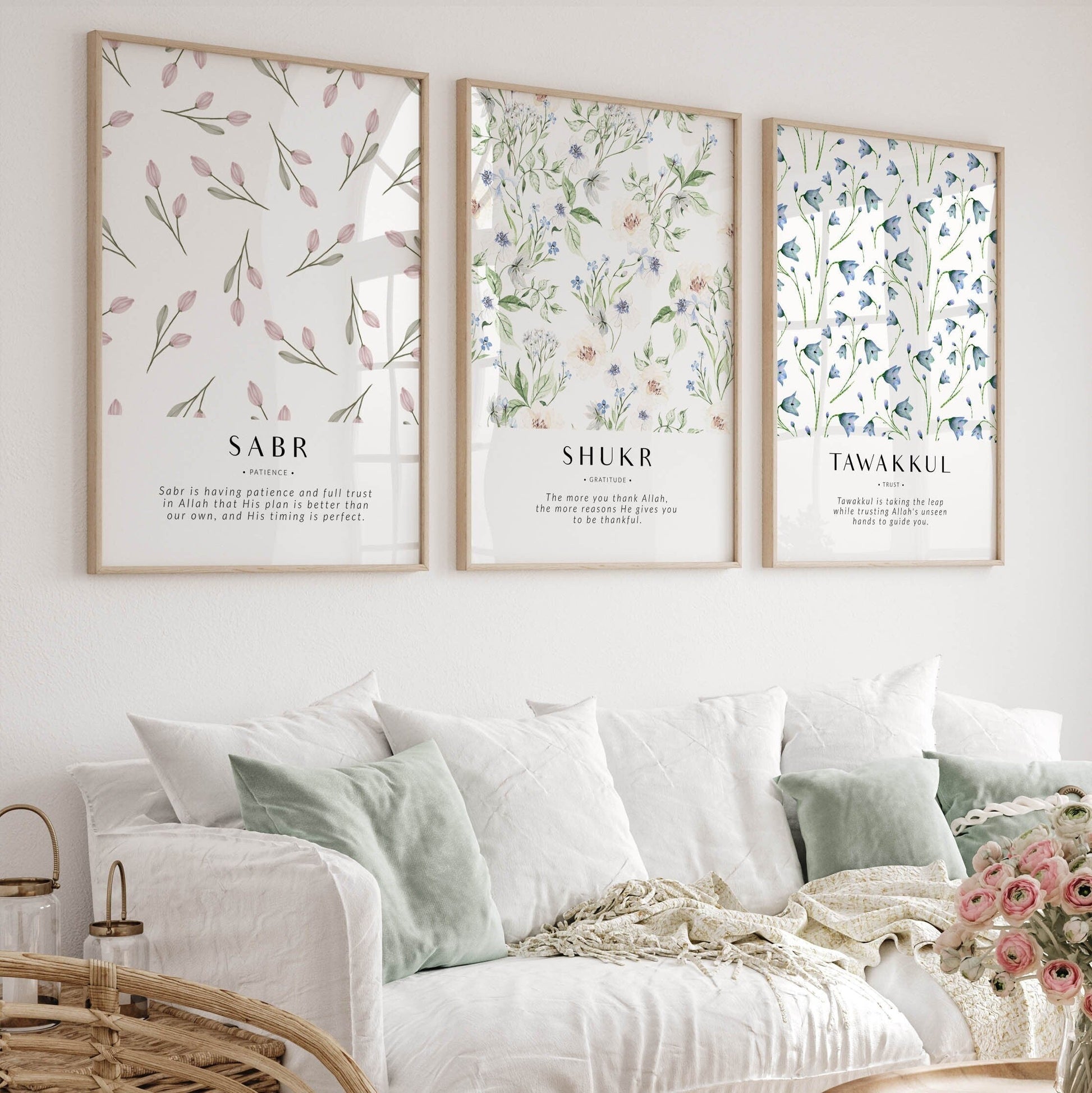 Elevate your home decor with inspiring Islamic wall art featuring floral Islamic art, perfect for Muslim home decor. This artwork embodies the virtues of Sabr (patience), Shukr (gratitude), and Tawaqqul (reliance on Allah), serving as a beautiful reminder of spiritual values. Add a touch of elegance and spirituality to your living space with this modern artwork. Explore our collection to find the perfect piece to inspire and uplift your home decor.