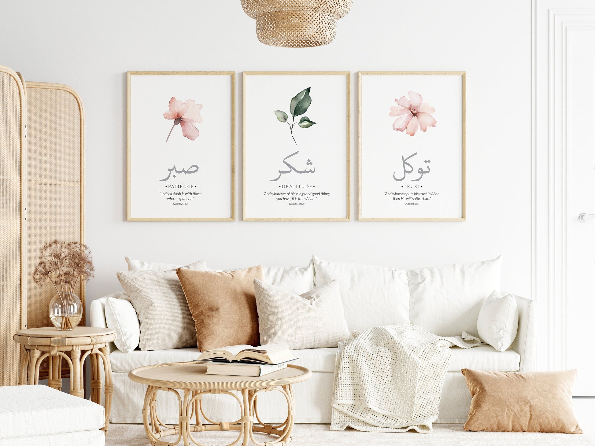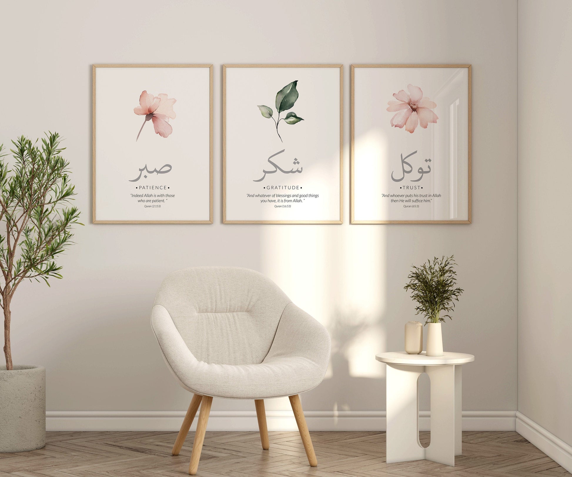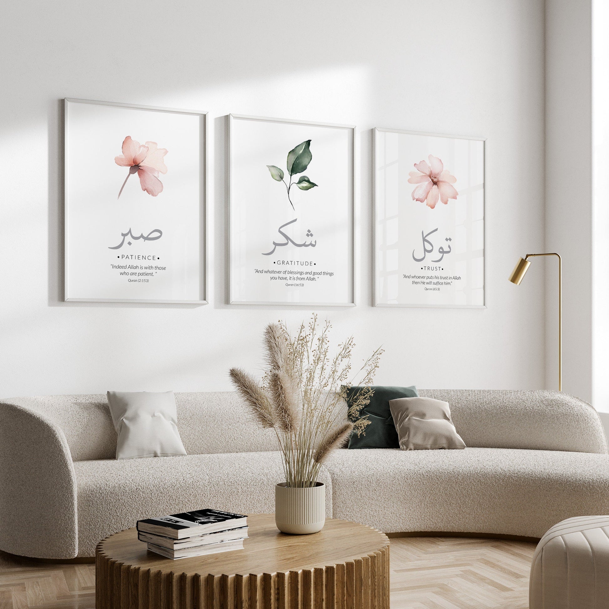 Elevate your space with Islamic quotes wall art featuring floral Islamic art, perfect for Muslim home decor. This artwork embodies the virtues of Sabr (patience), Shukr (gratitude), and Tawaqqul (reliance on Allah), serving as a beautiful reminder of spiritual values. Add a touch of elegance and spirituality to your living space with this modern artwork. Explore our collection to find the perfect piece to inspire and uplift your home decor.