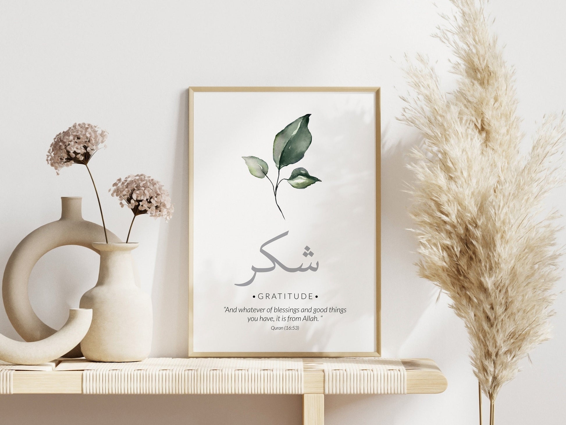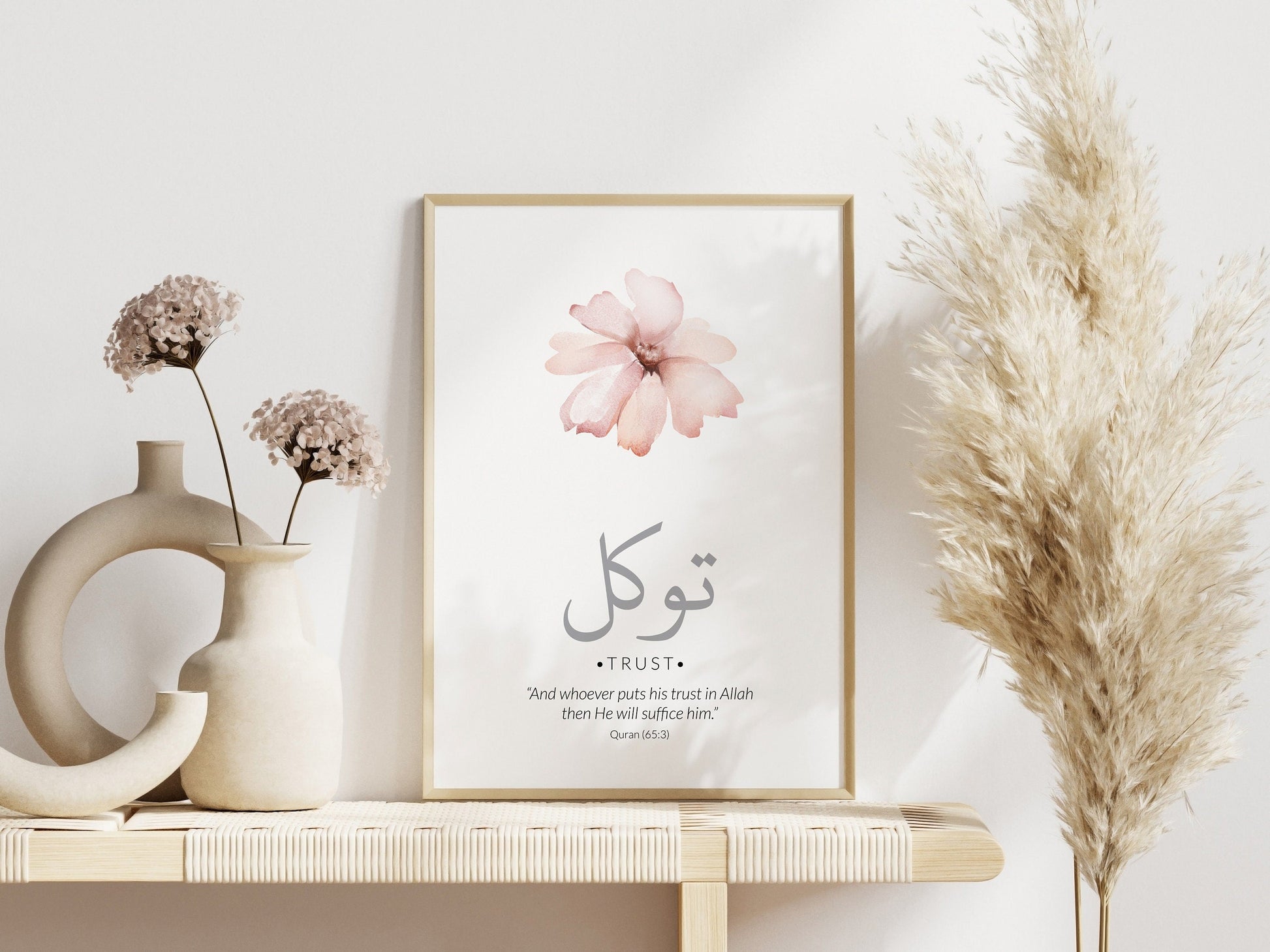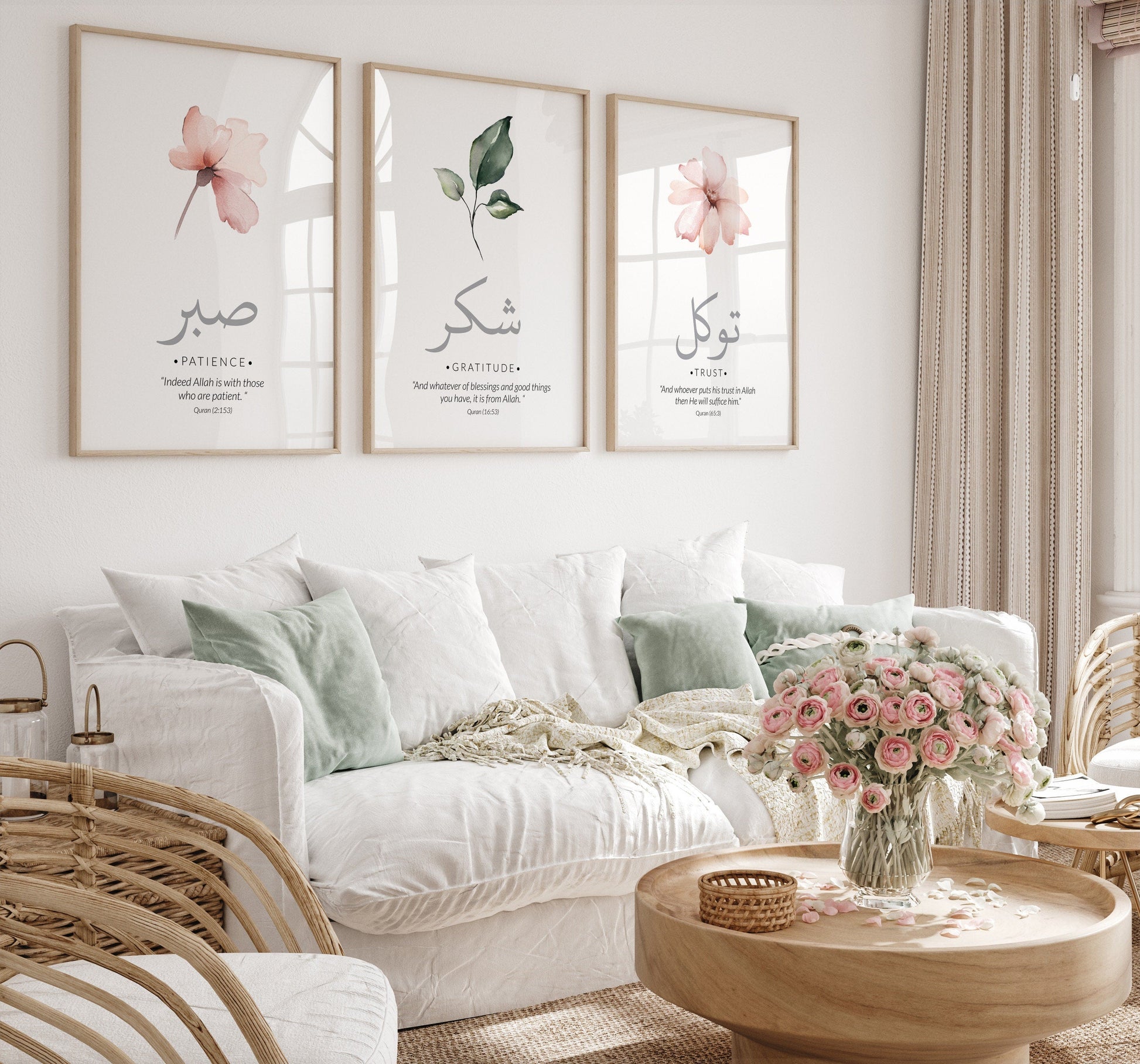 Elevate your space with Islamic quotes wall art featuring floral Islamic art, perfect for Muslim home decor. This artwork embodies the virtues of Sabr (patience), Shukr (gratitude), and Tawaqqul (reliance on Allah), serving as a beautiful reminder of spiritual values. Add a touch of elegance and spirituality to your living space with this modern artwork. Explore our collection to find the perfect piece to inspire and uplift your home decor.