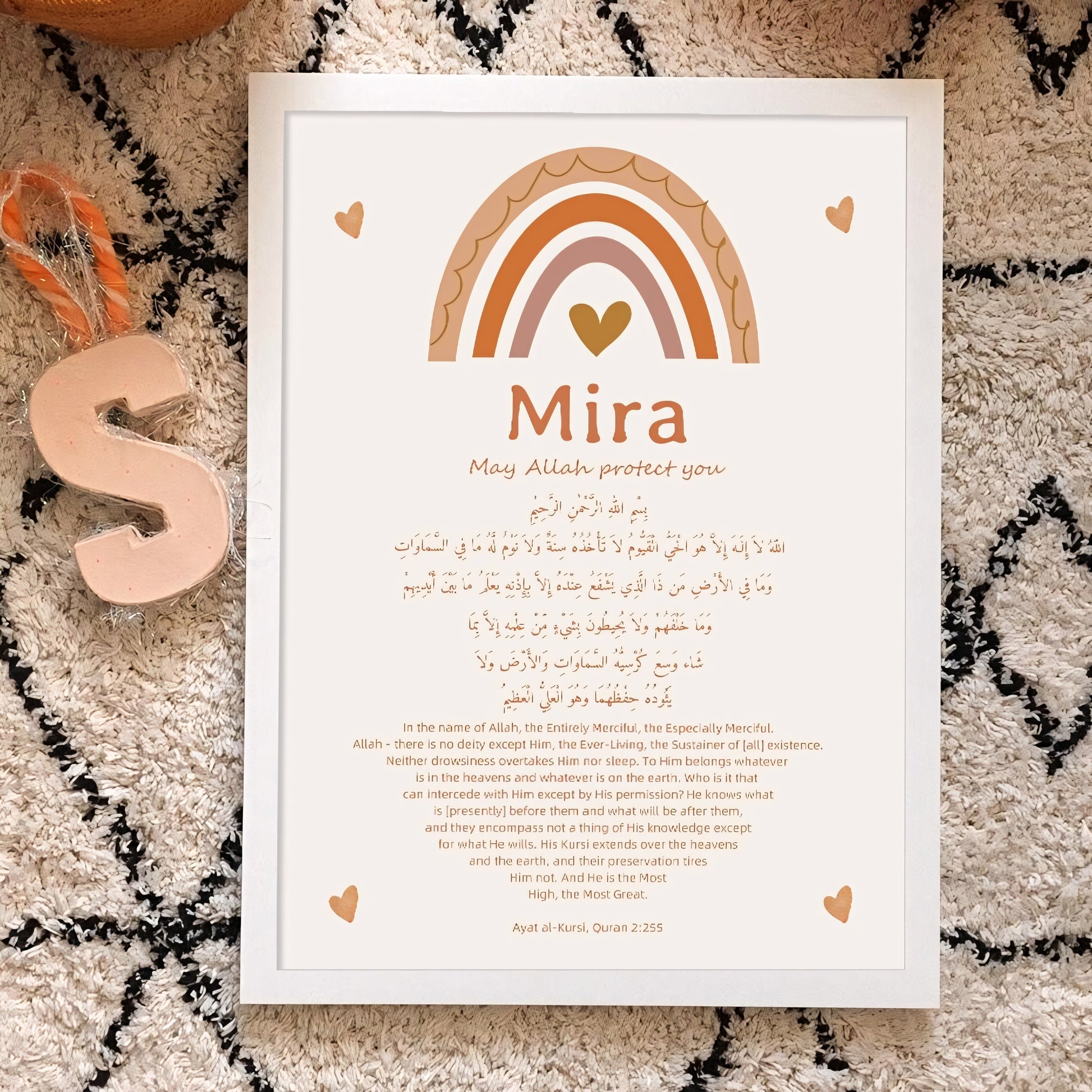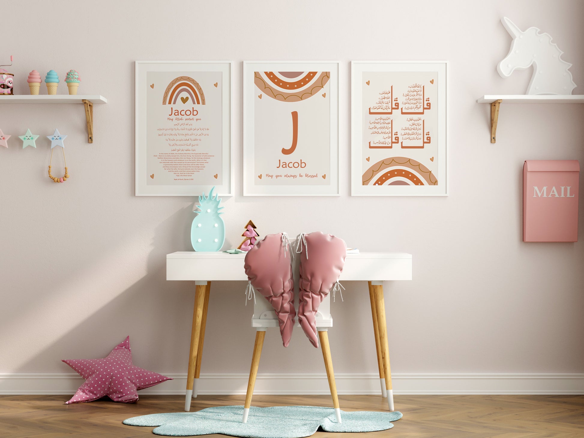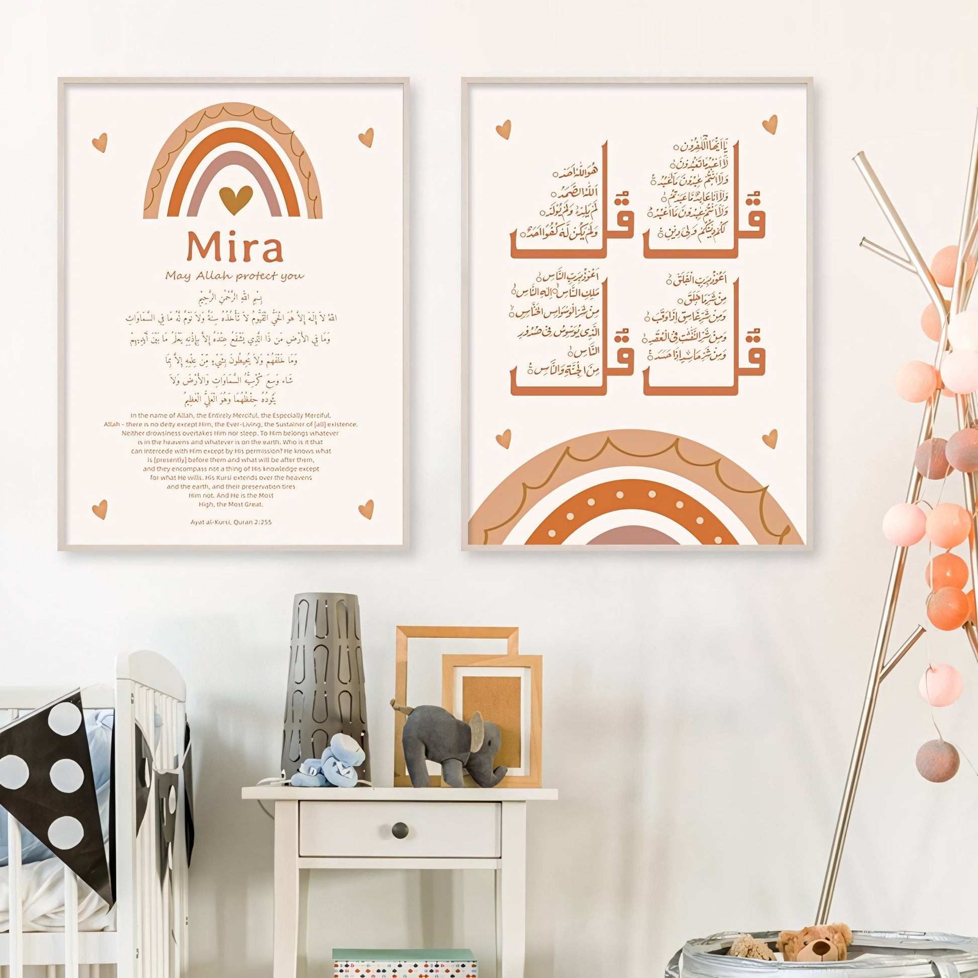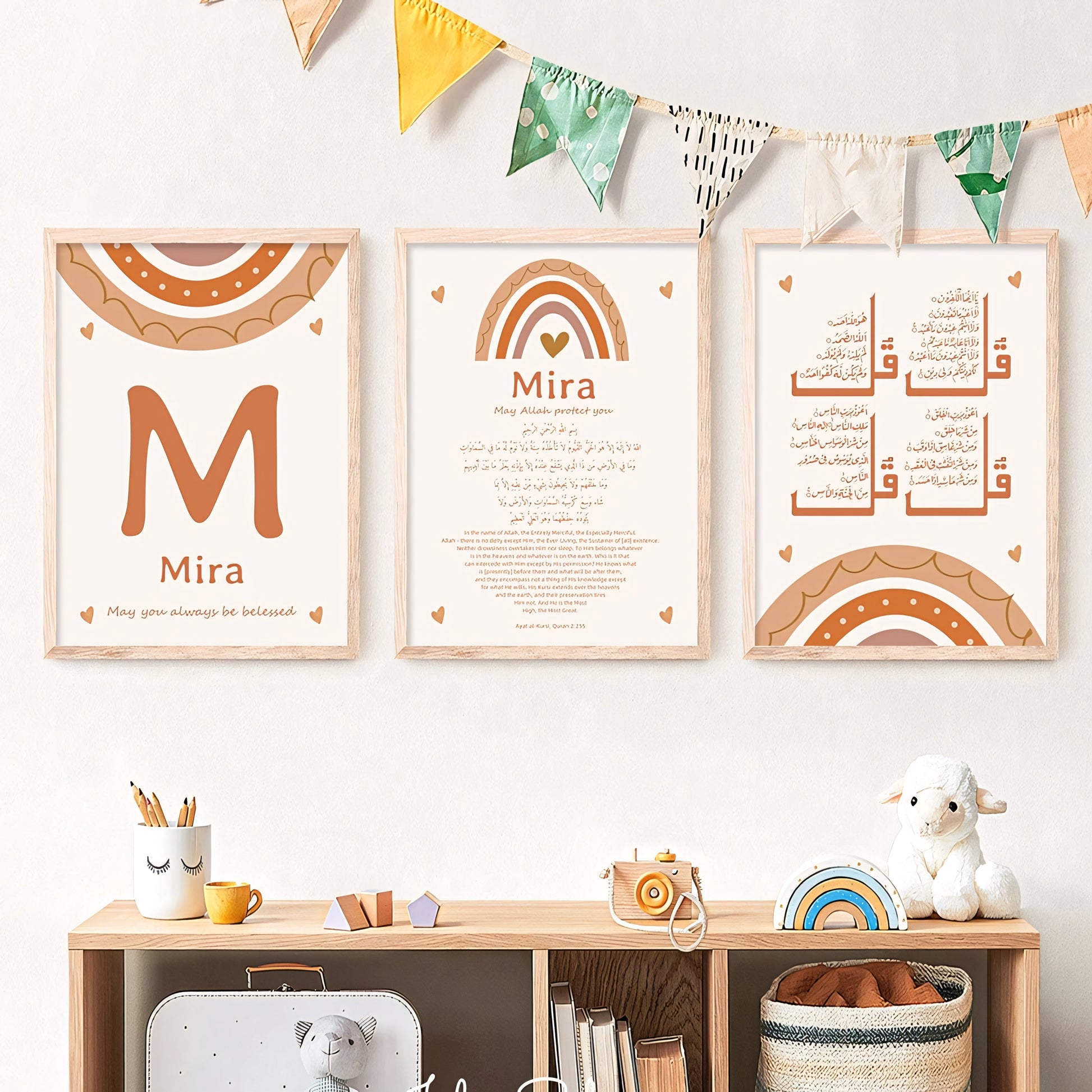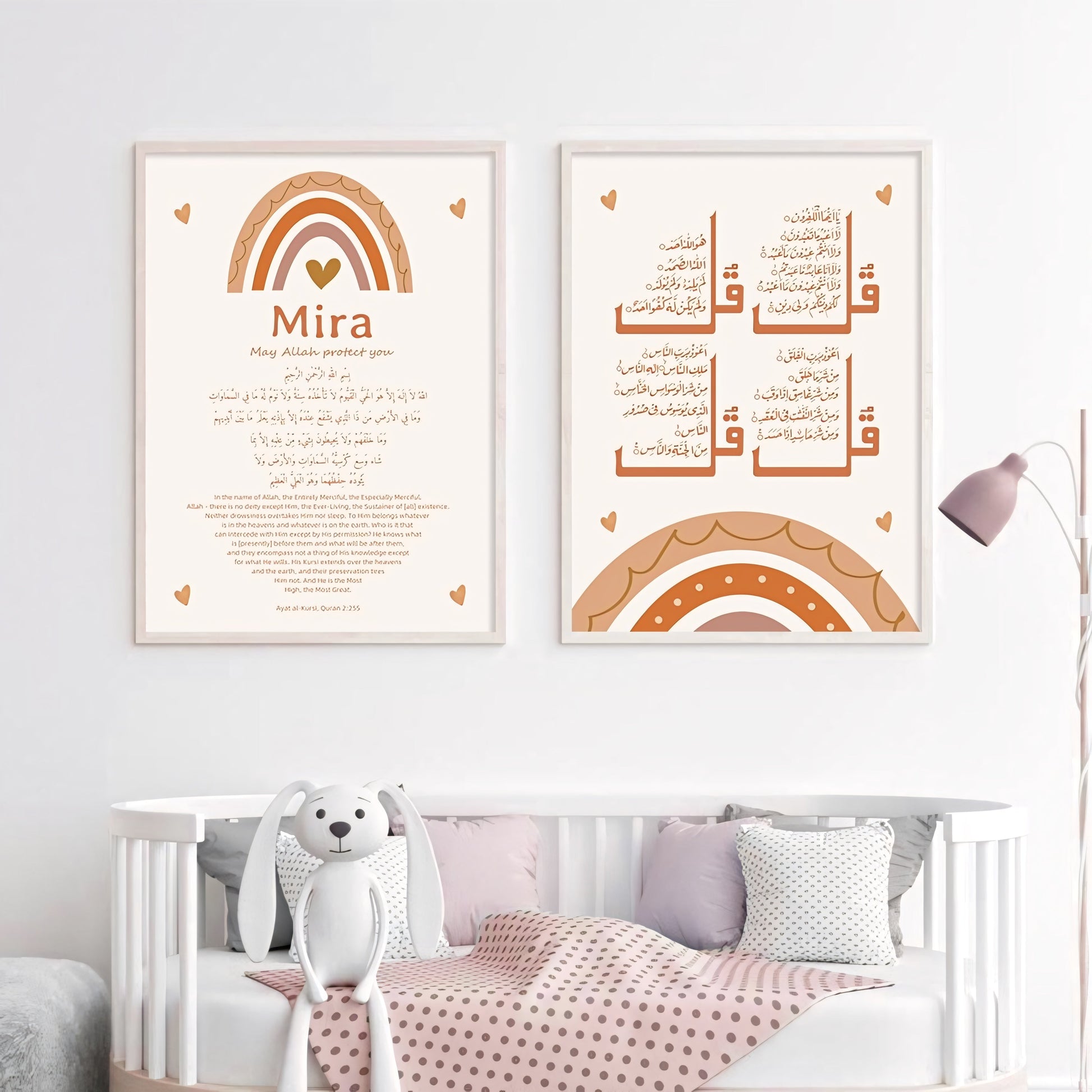 Create a beautiful and meaningful space for your child with this personalized Islamic wall art. Featuring their name, the powerful Ayatul Kursi, and the Four Quls for protection and guidance, this watercolor artwork is a cherished addition to any Muslim nursery or child's room.