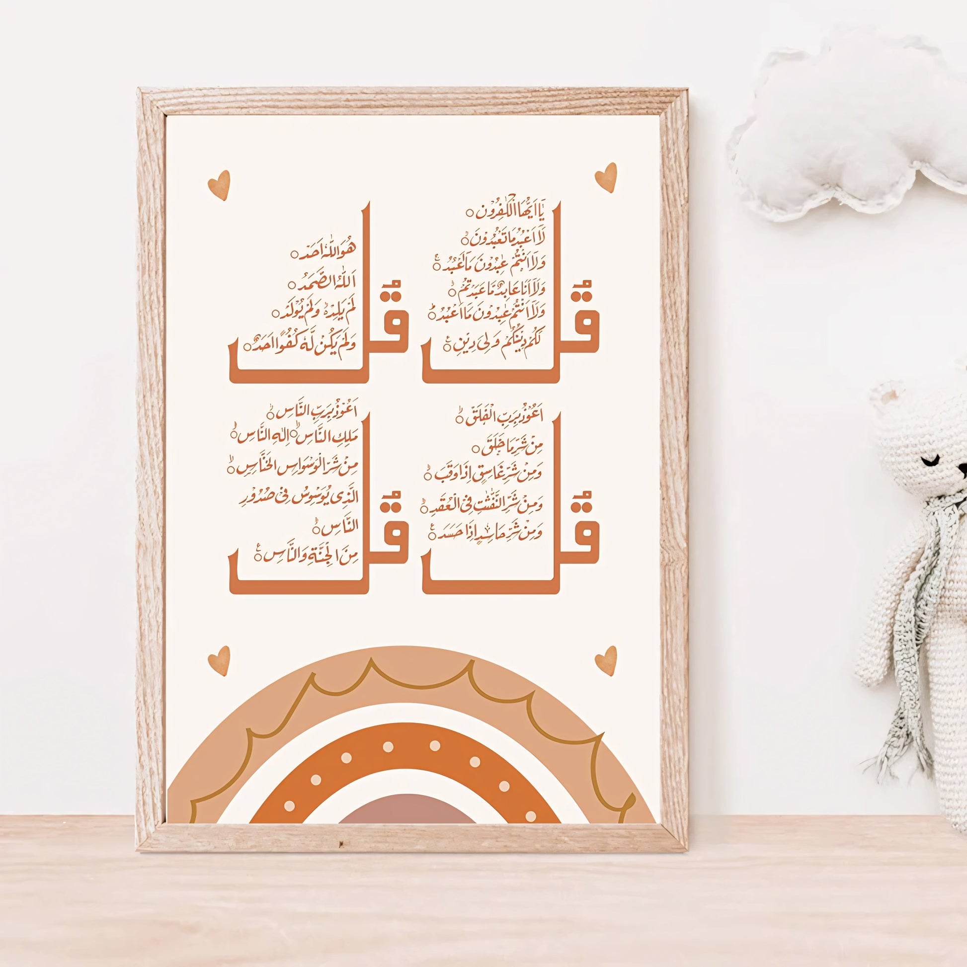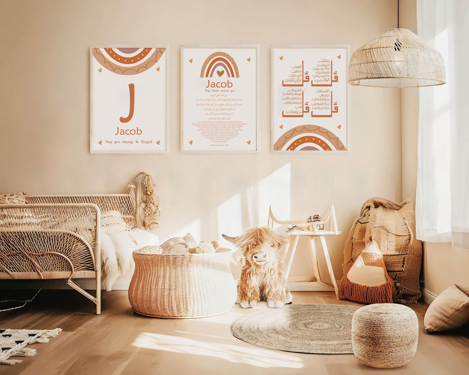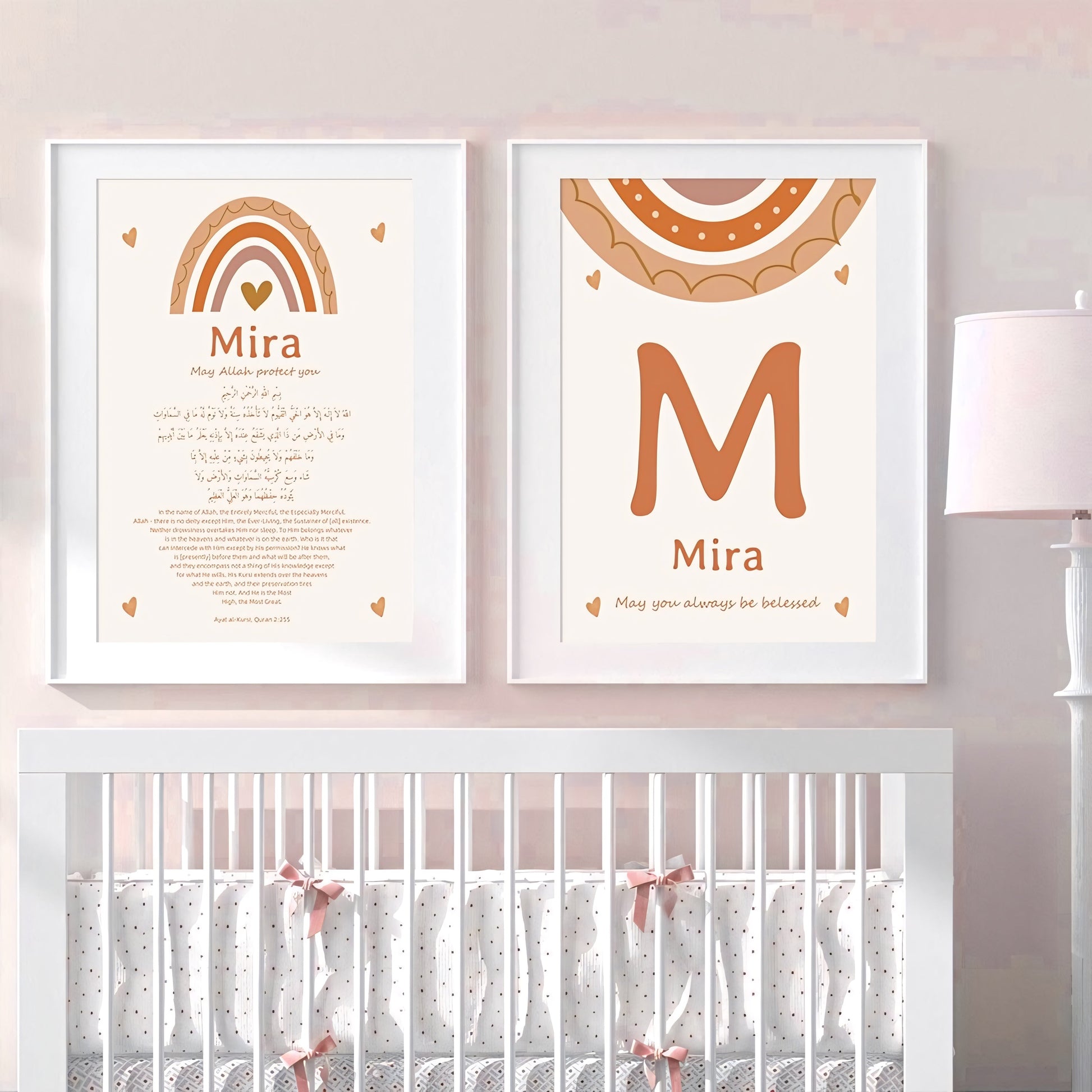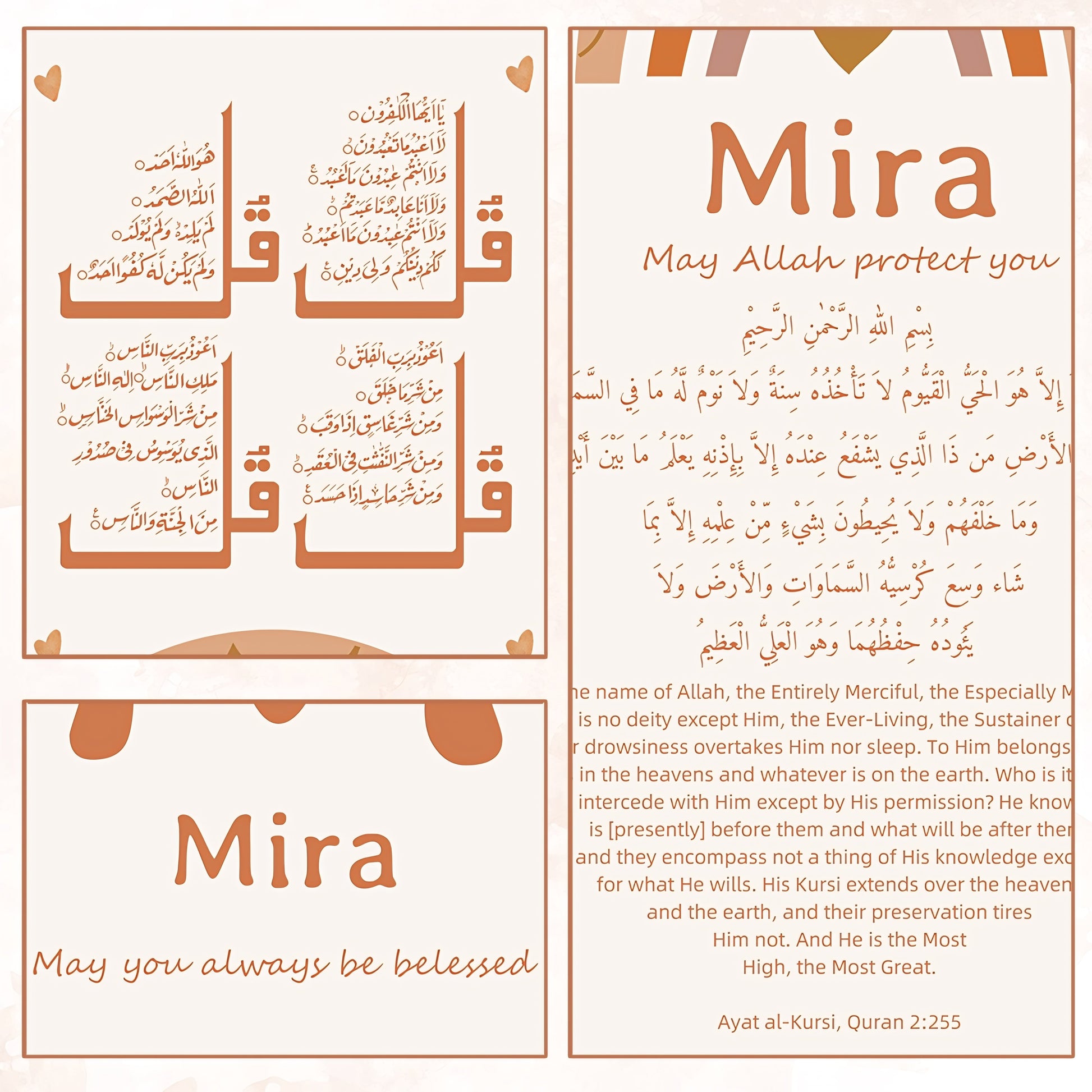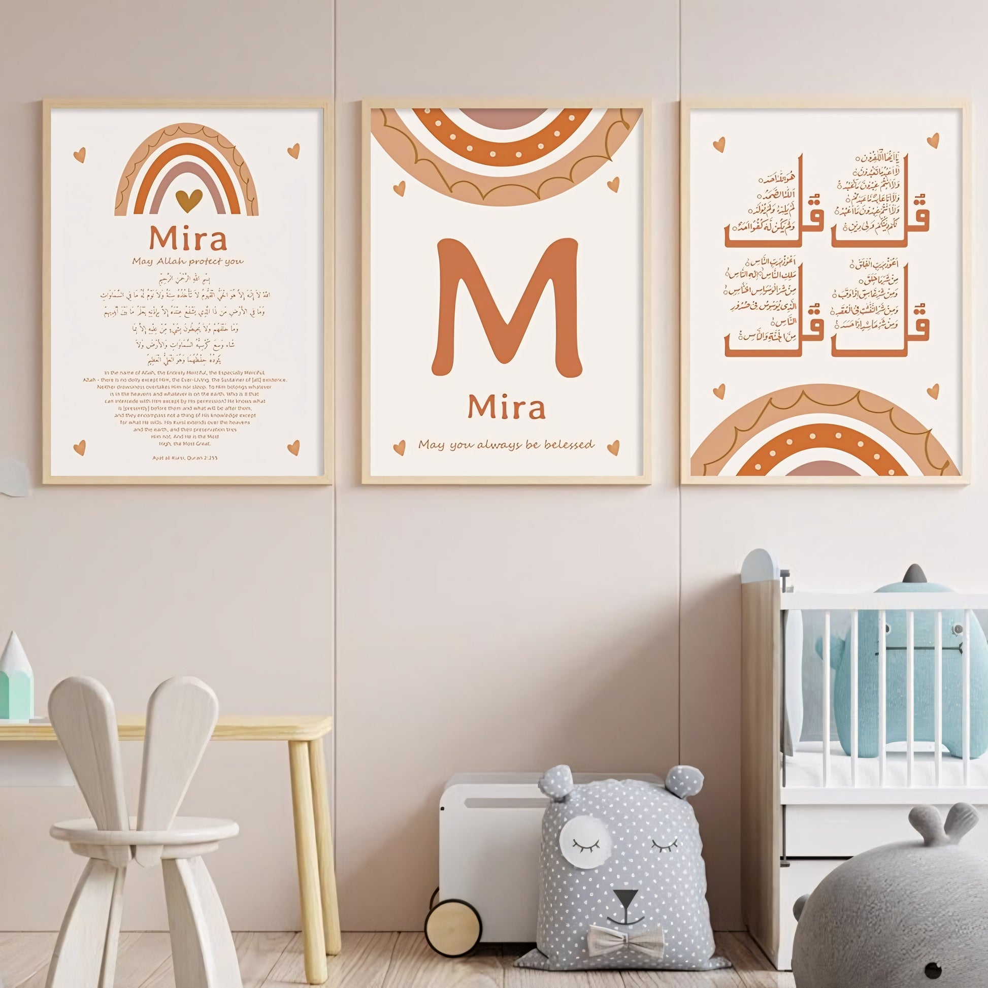 Create a beautiful and meaningful space for your child with this personalized Islamic wall art. Featuring their name, the powerful Ayatul Kursi, and the Four Quls for protection and guidance, this watercolor artwork is a cherished addition to any Muslim nursery or child's room.